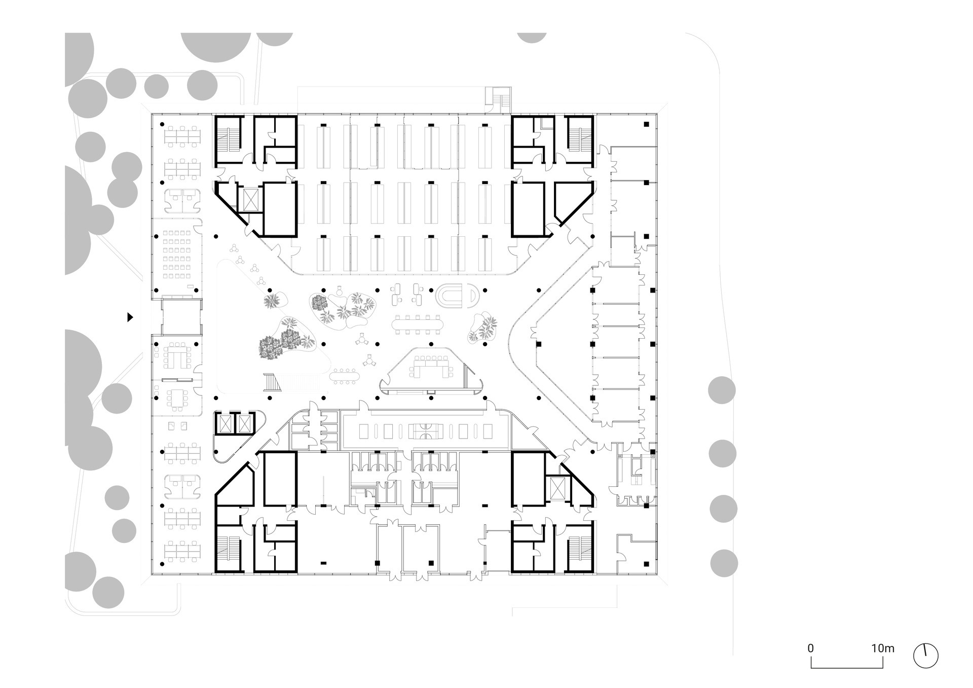 The compact cube opens to the campus and to the city through two deeply incised atria, which are enclosed by a staggered, cantilevered arrangement of the upper floors. Daylight filters through the glass ceilings of the atria into the center of the building. Various plant species from the neighboring Odenwald region, including trees up to nine meters tall, are incorporated into the building complete with their soil to transform the atria into recreational spaces.