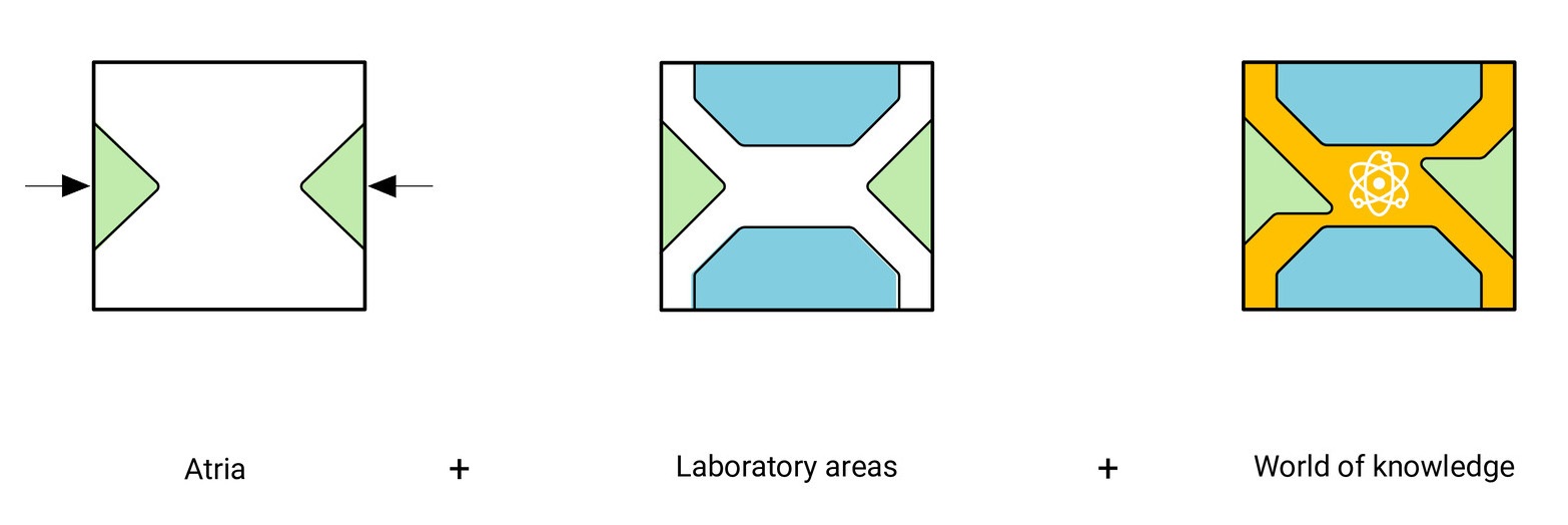 The open-plan layout of the upper stories combines laboratories and offices to create a coherent workspace. Laboratory areas are located opposite each other on two outer sides of the building. The world of knowledge unfolds in-between, including office space and shared communication areas for professional and informal exchange between employees.