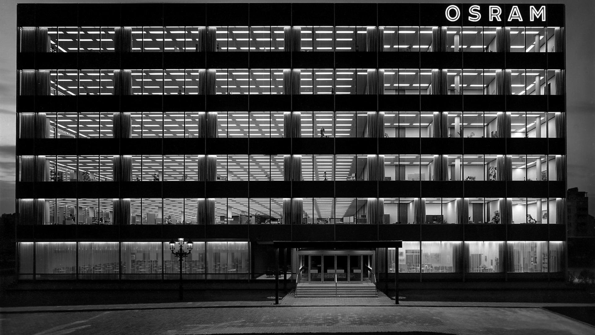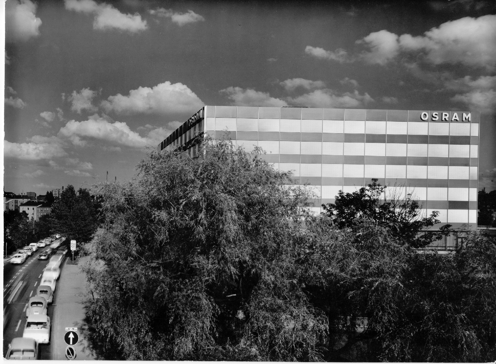 Walter Henn completed the administration building, the research and development centre and the power facilities block for the light bulb manufacturer Osram in 1965. The ensemble stands on Candidstraße near the Isar water meadows and is the global corporate headquarters. As befitting the corporate activities of Osram, the building looks like a transparent silvery glistening cube, which emits light from within during the evening hours.