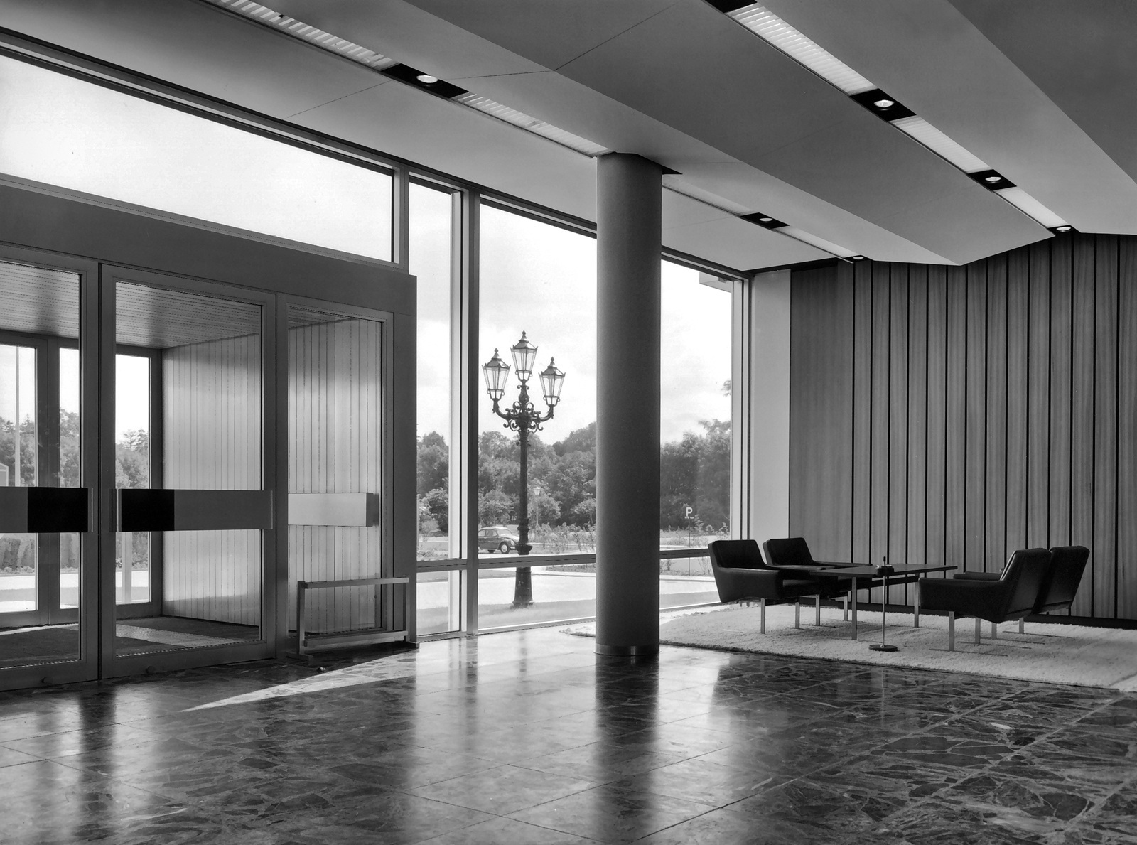 The main entrance on the south side is recognisable to the outside world by a long cantilevering steel canopy. The external appearance of the fully air-conditioned steel skeletal-framed building is defined by the suspended light-metal facade with the balustrade panels and the fixed double glazing running in bands along the building and accentuated by vertical, silver-grey anodised glazing bars. White light-metal external lamellae provide protection against solar radiation.