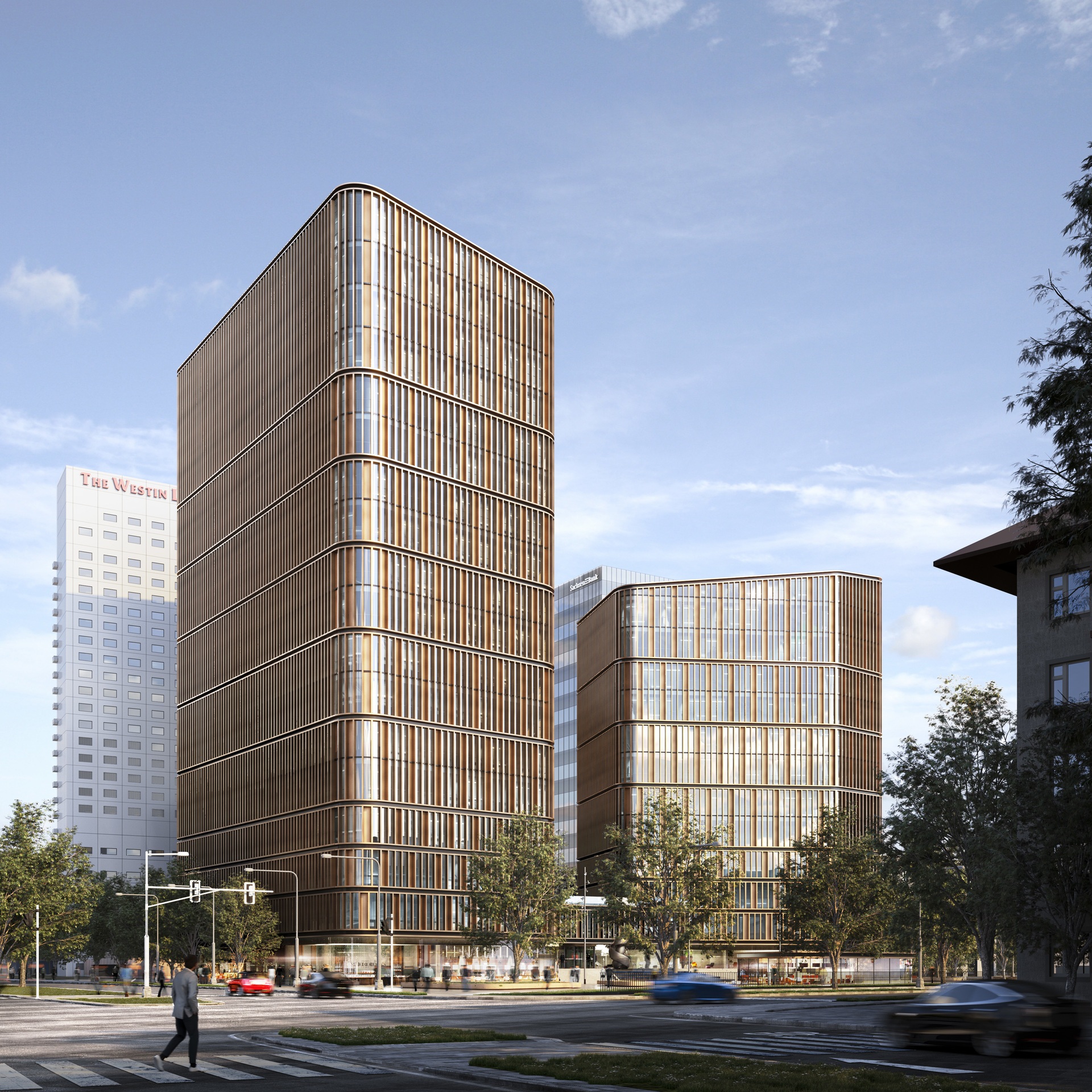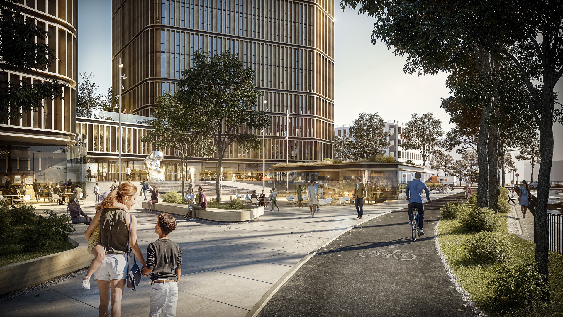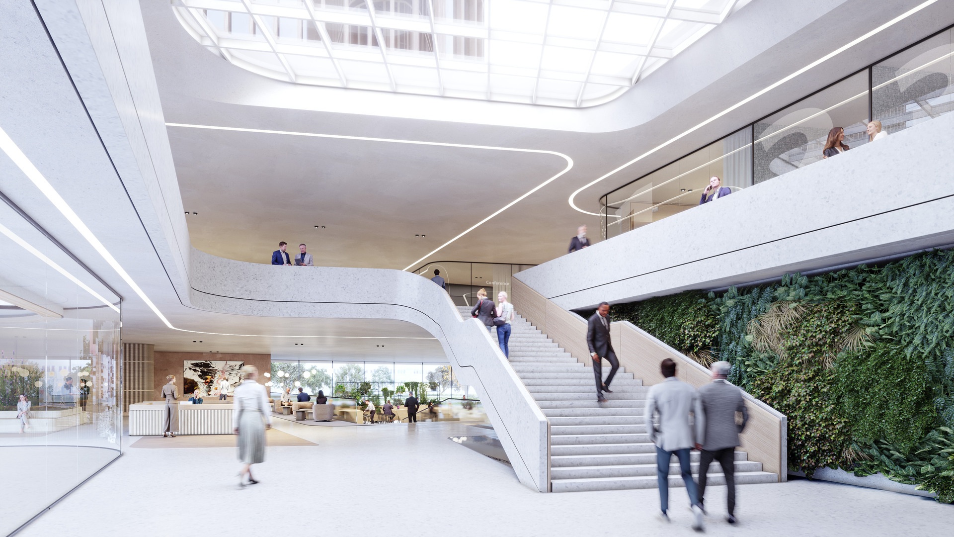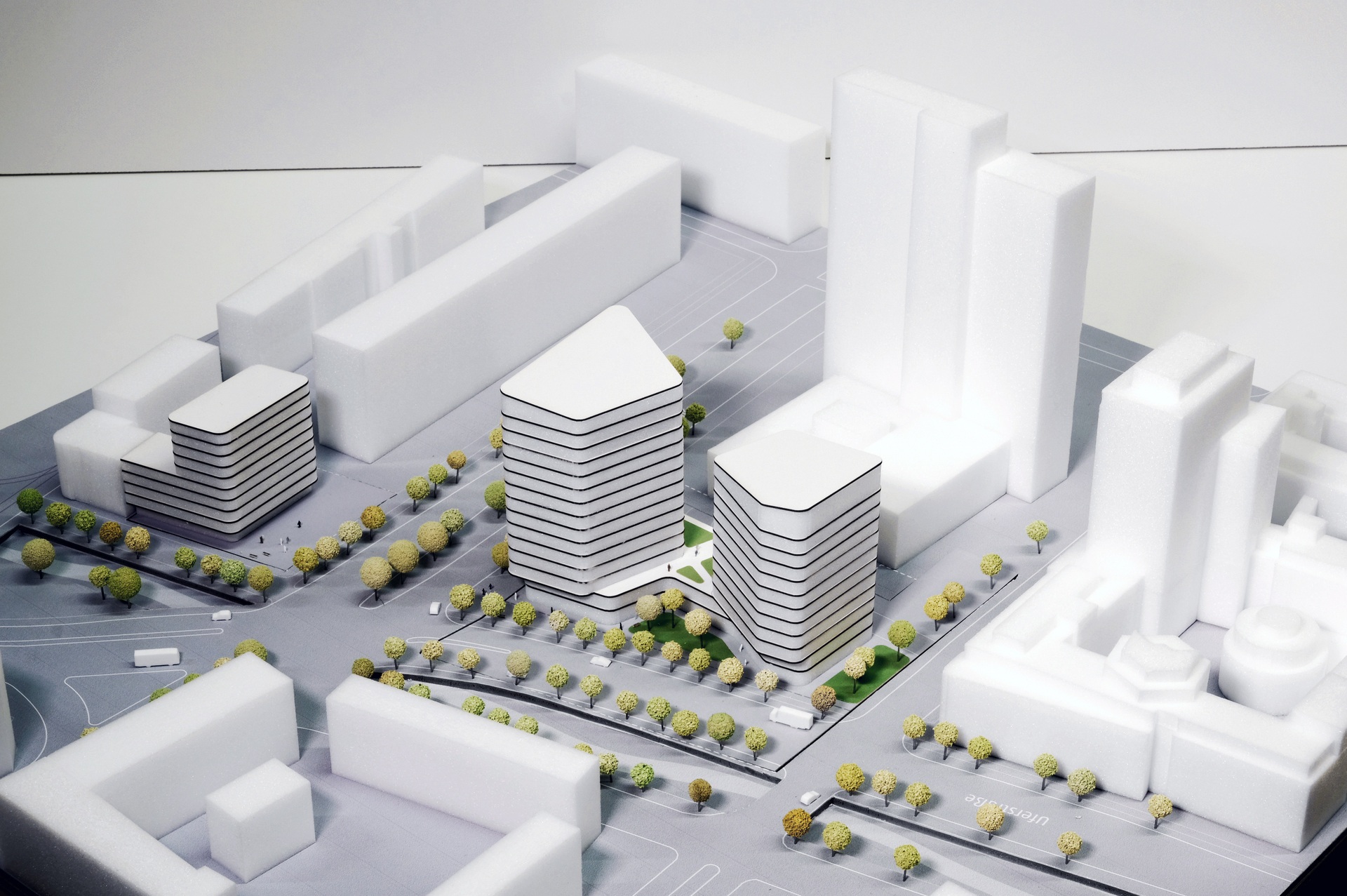 The street-side building with its 2-storey base is positioned on the lateral building boundaries, takes up the lines of the built environment and enhances Leipzig's skyline with its well-proportioned and elegant appearance. In combination with the transparent, structured and lively facades, the softly flowing forms of the ensemble generate a differentiated perception from all viewing angles.