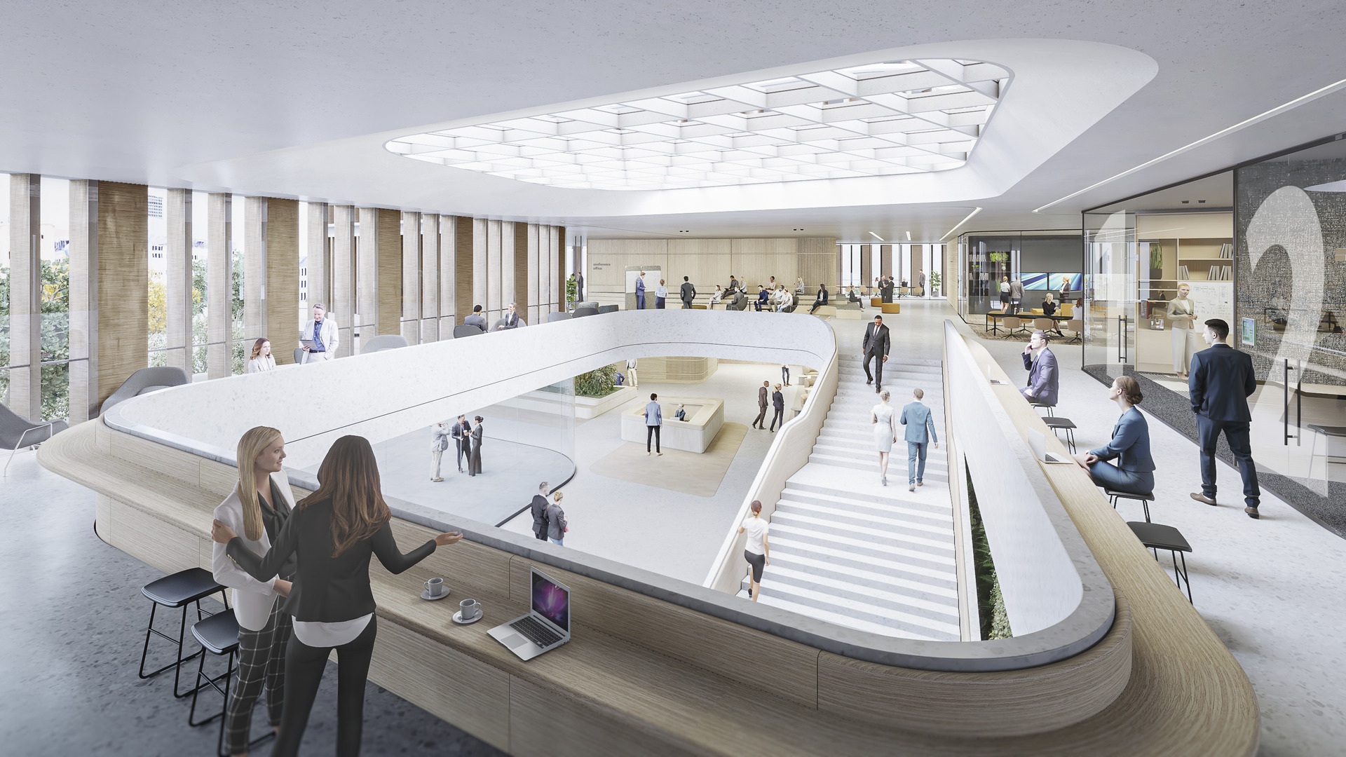 A recess on the northern boundary of the site results in a large riverbank situation that rearranges it and adds a public urban space. This recess serves as the main entrance for the users and as an inviting gesture to the neighbours with regard to the multi-faceted range of retail shops, cafés and restaurants in the building's base.