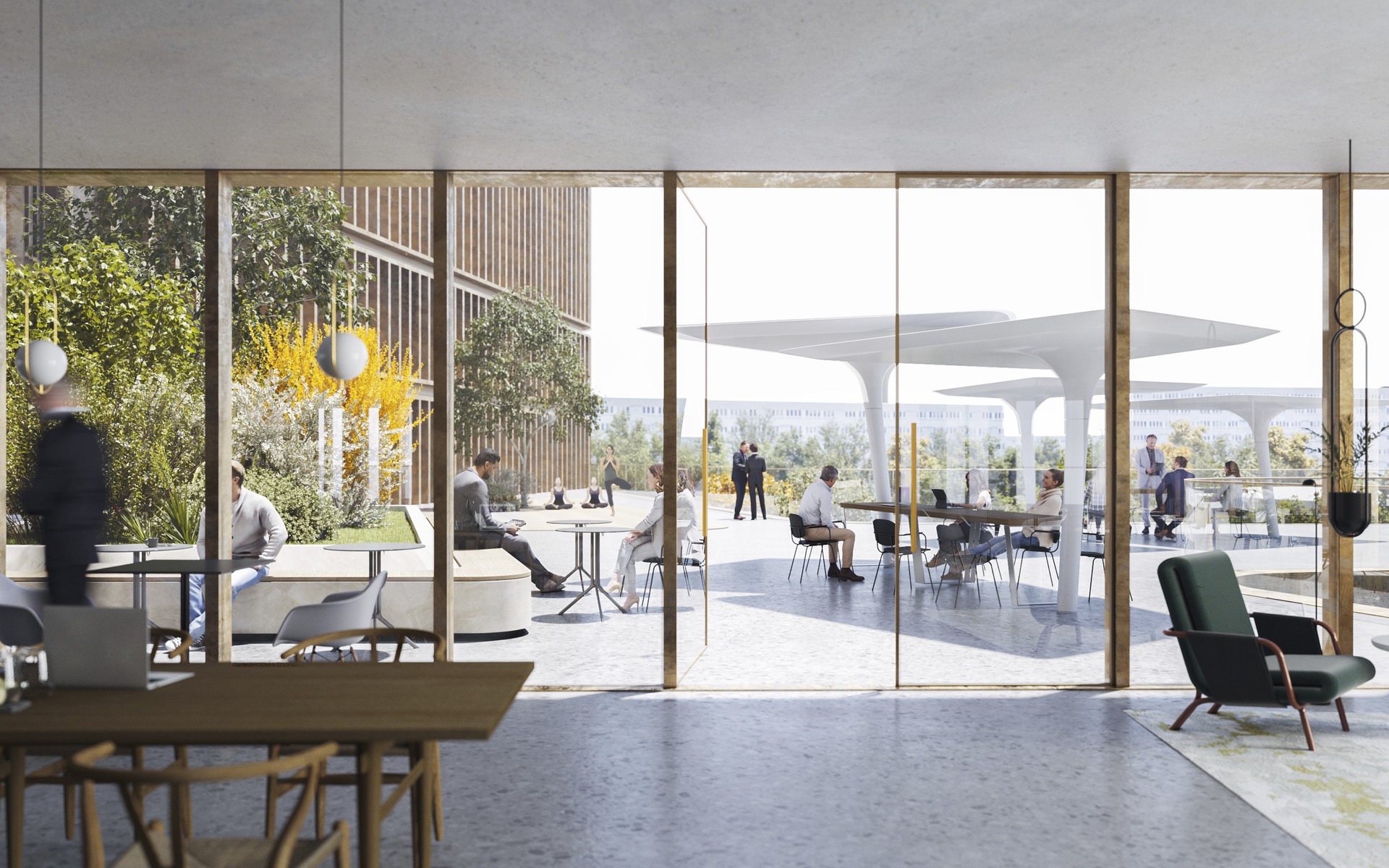 The landscape-architectural concept of the open space is emphasised by the roof garden in the intermediate space between the buildings, and offers an additional attractive working environment.