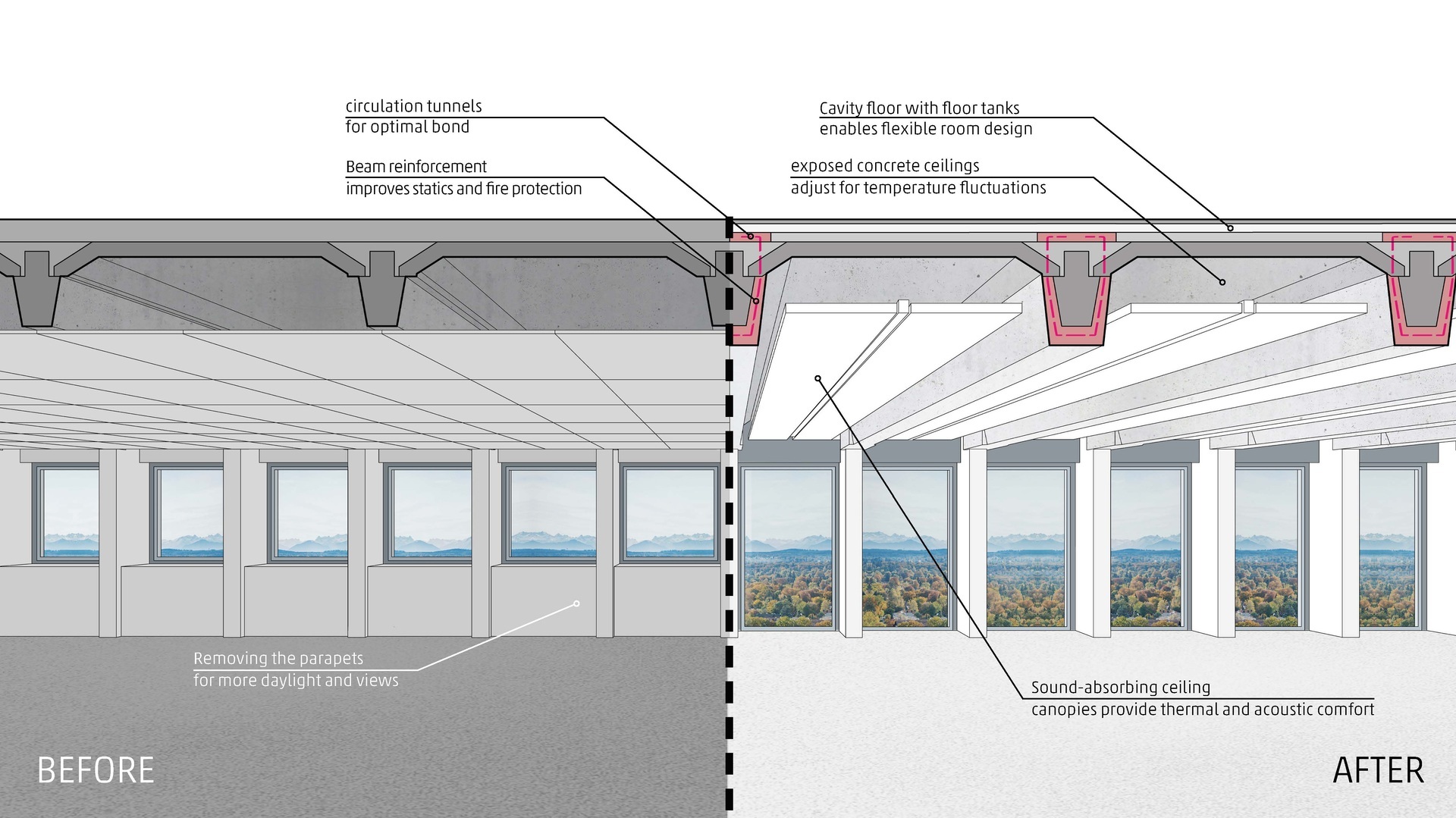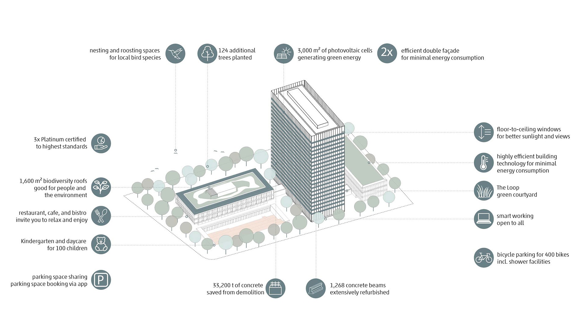 The decision to conserve and repurpose the existing concrete tower, leaving the cores and structures untouched wherever possible, saves over 5,000 tons of carbon. The original façade has to be replaced to increase the energy efficiency of the building. The new façade references the original pattern, facilitates sun shading between two glass layers while maintaining the intake of fresh air from outside.