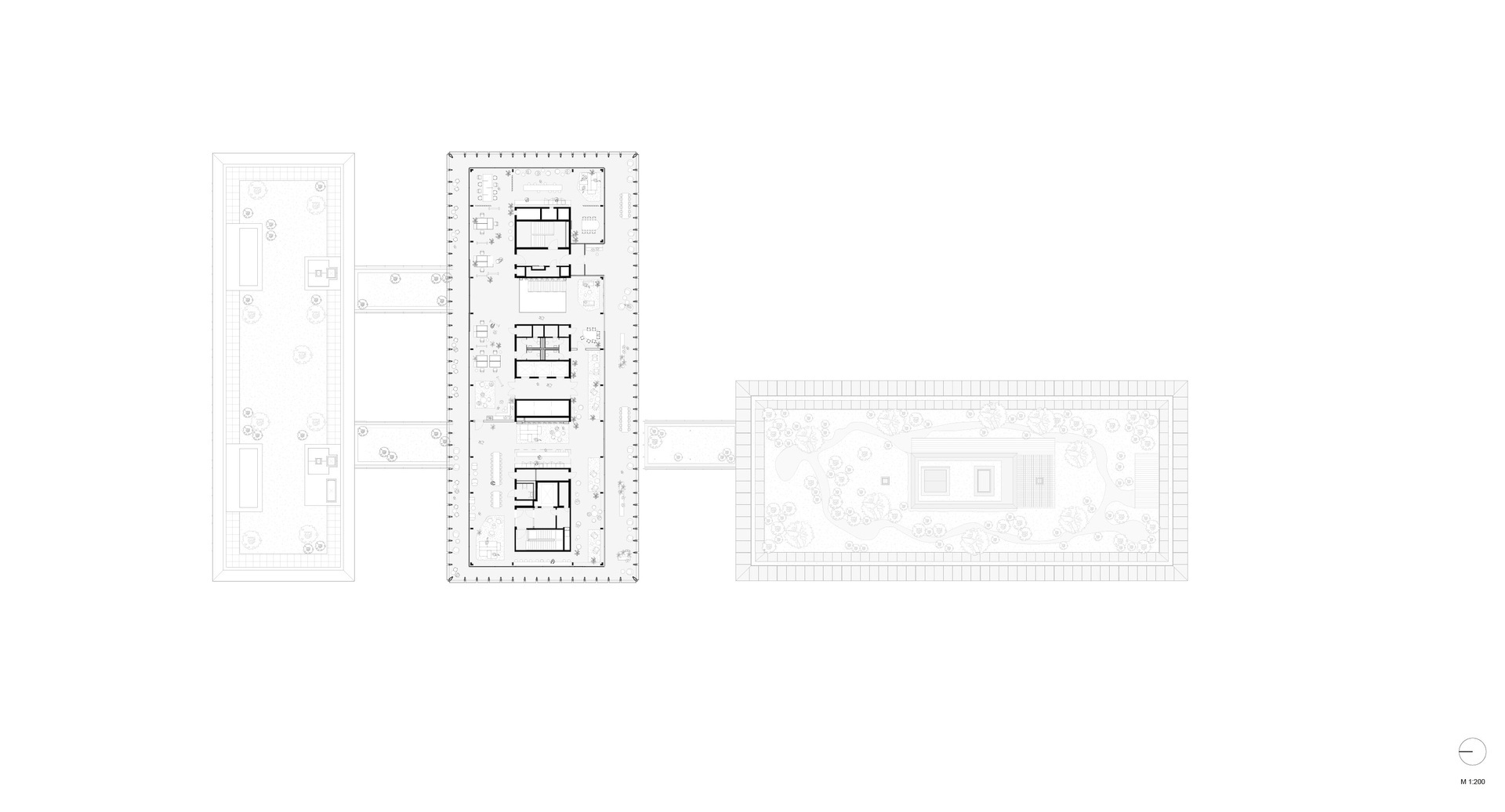 The northern building will function as the main entrance to the complex, while the southern building is embedded in dense greenery. A sunken courtyard is designed as a terraced playscape for the daycare center.