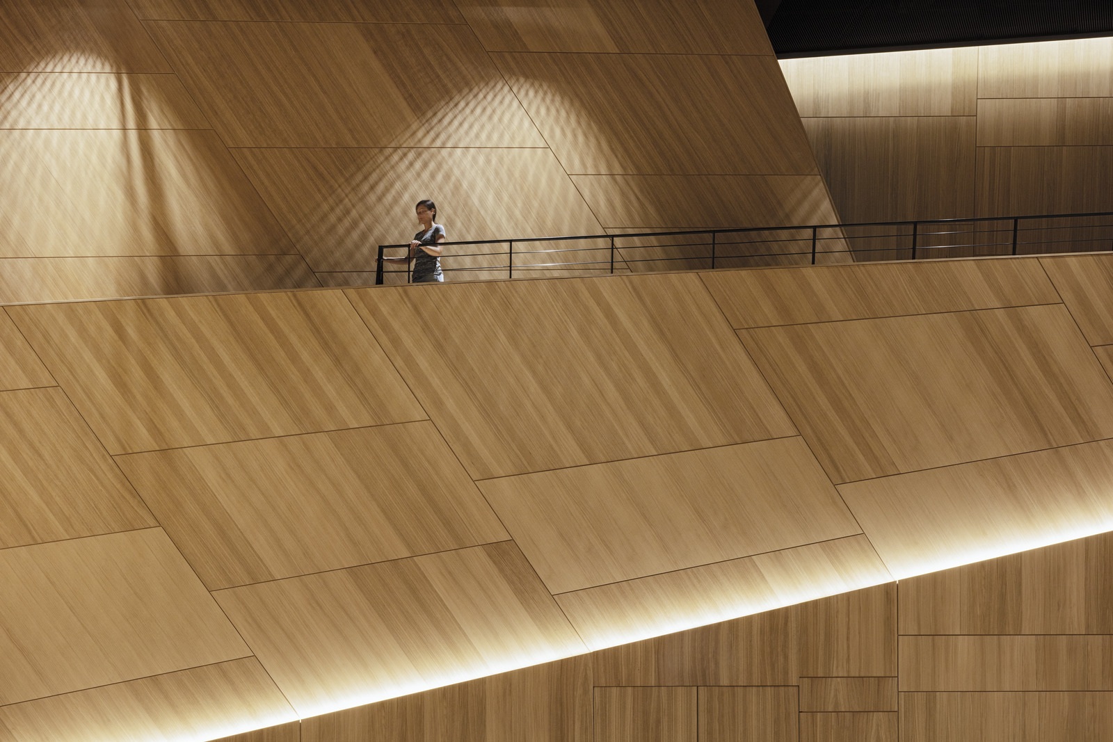 Its sculptural shape and sharp edges make the new concert hall stand out from the surrounding hilly landscape. Like the wooden corpus of a musical instrument, the outer shell of the building is made of wood.