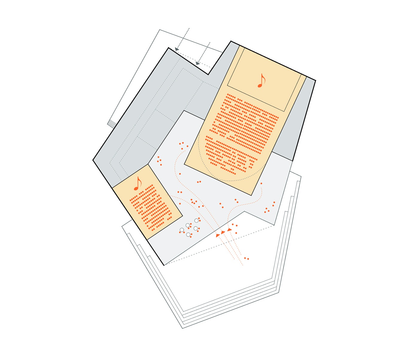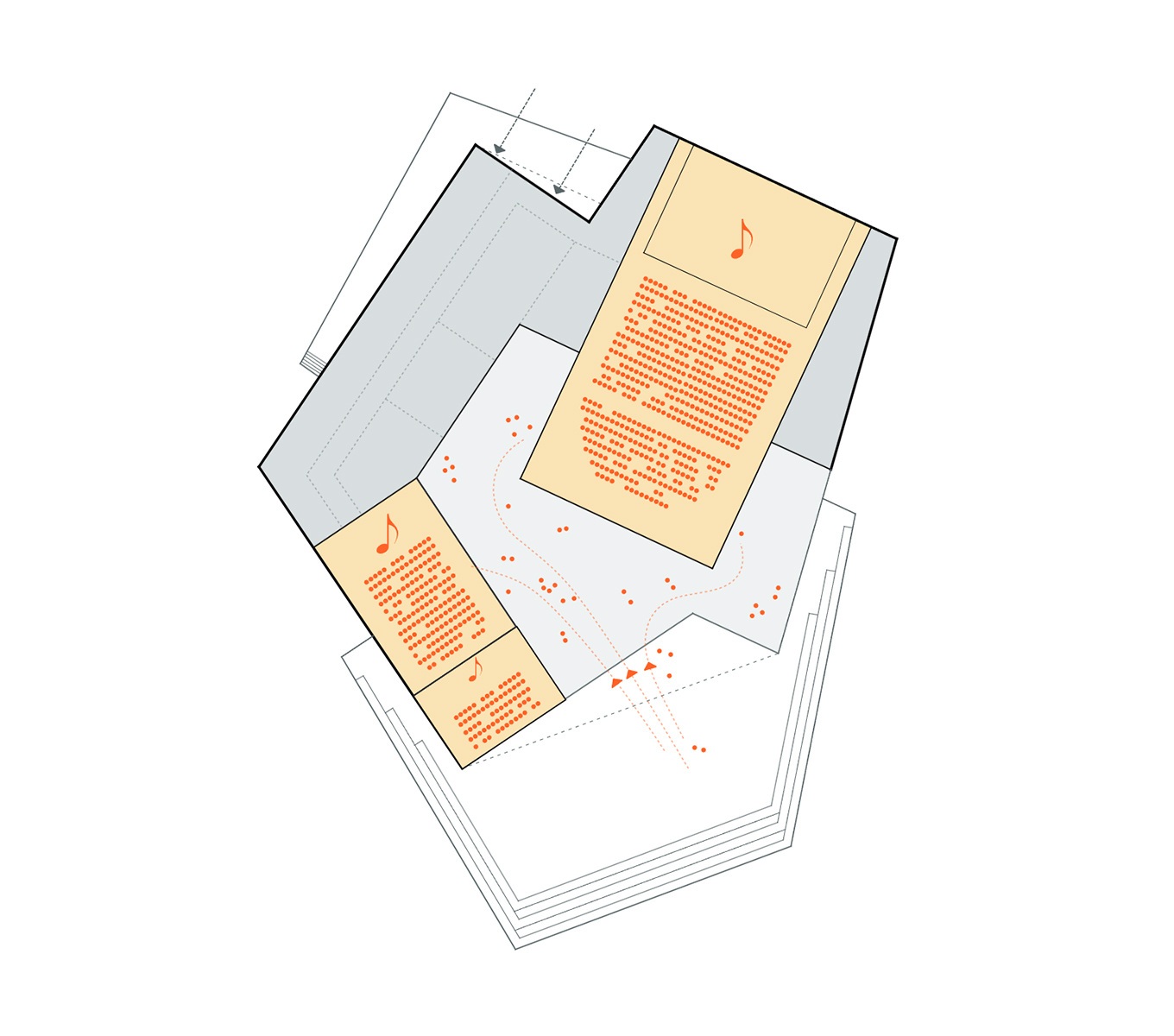 The single-story building with its slightly sloping roofs is composed of two volumes: The larger of them houses the grand concert hall whose trapezoidal stage, inclined wall panels and reflective ceiling elements provide excellent acoustics.