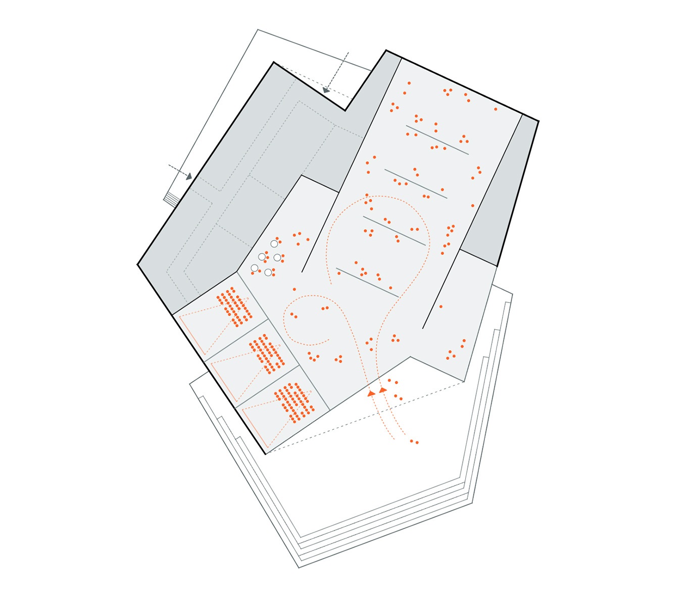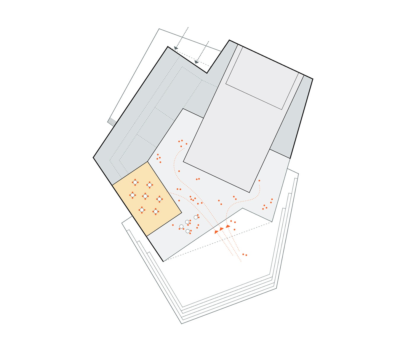 In the southeast corner, a deep cut into the façade marks the main entrance. The lobby’s extensive glazed front opens up invitingly to the forecourt with a terrace in front.