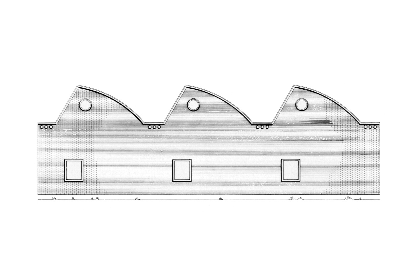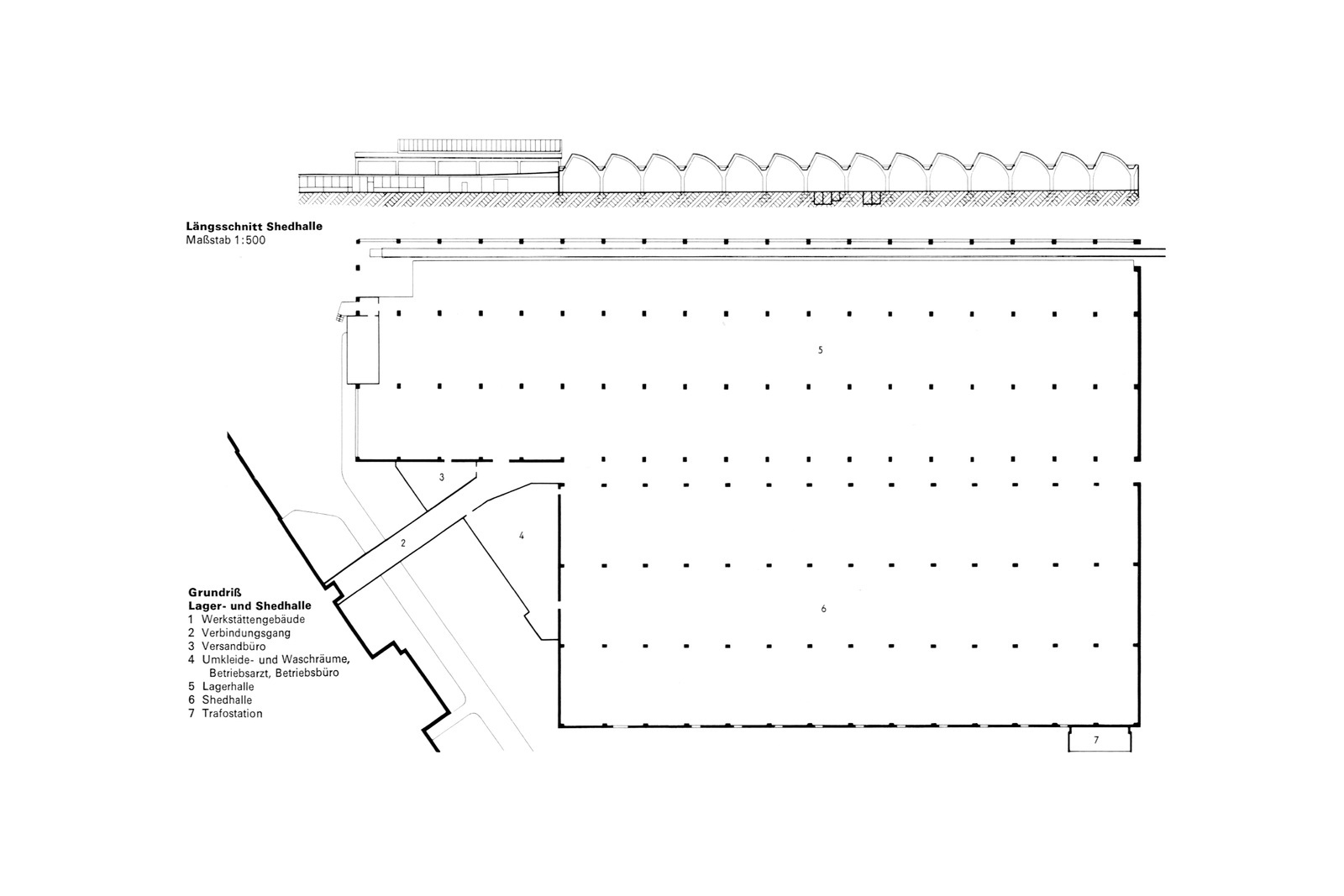 The single-storey, three-aisle production hall with transverse sheds was designed as a reinforced concrete shell structure and provided a continuous production area illuminated by glare-free north light. Because the space is evenly lit, the external walls of the 112 metre long x 48 metre wide building could be designed largely without window openings. The facades appear recessed due to functional details such as the overflow outlets on the shed gutters, the exhaust air openings and the windows in the gables, the latter acting as "psychological side windows" to give a glimpse of the outside world. The masonry exterior wall surface, including the loadbearing structure, lies behind yellow split brick cladding. The interior is masonry panels between the fair-faced concrete skeleton members.