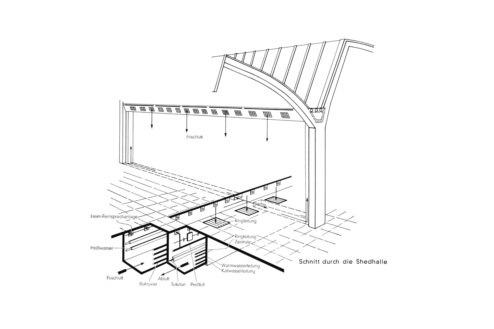 The shed hall claims a special position among the works of Walter Henn as it was his first post-war building completed without construction industry political restraints. From that point on, Henn built to modern standards and founded an aesthetic of functionality focused on modern international architecture, which produced a triad of function, structure and form.