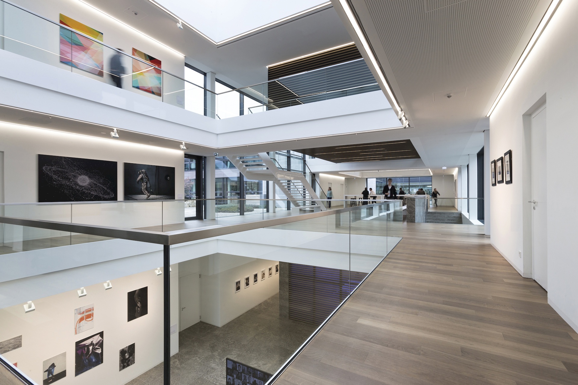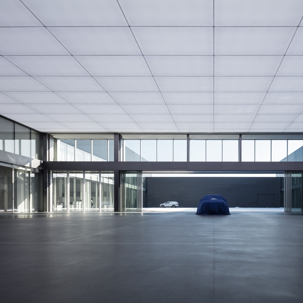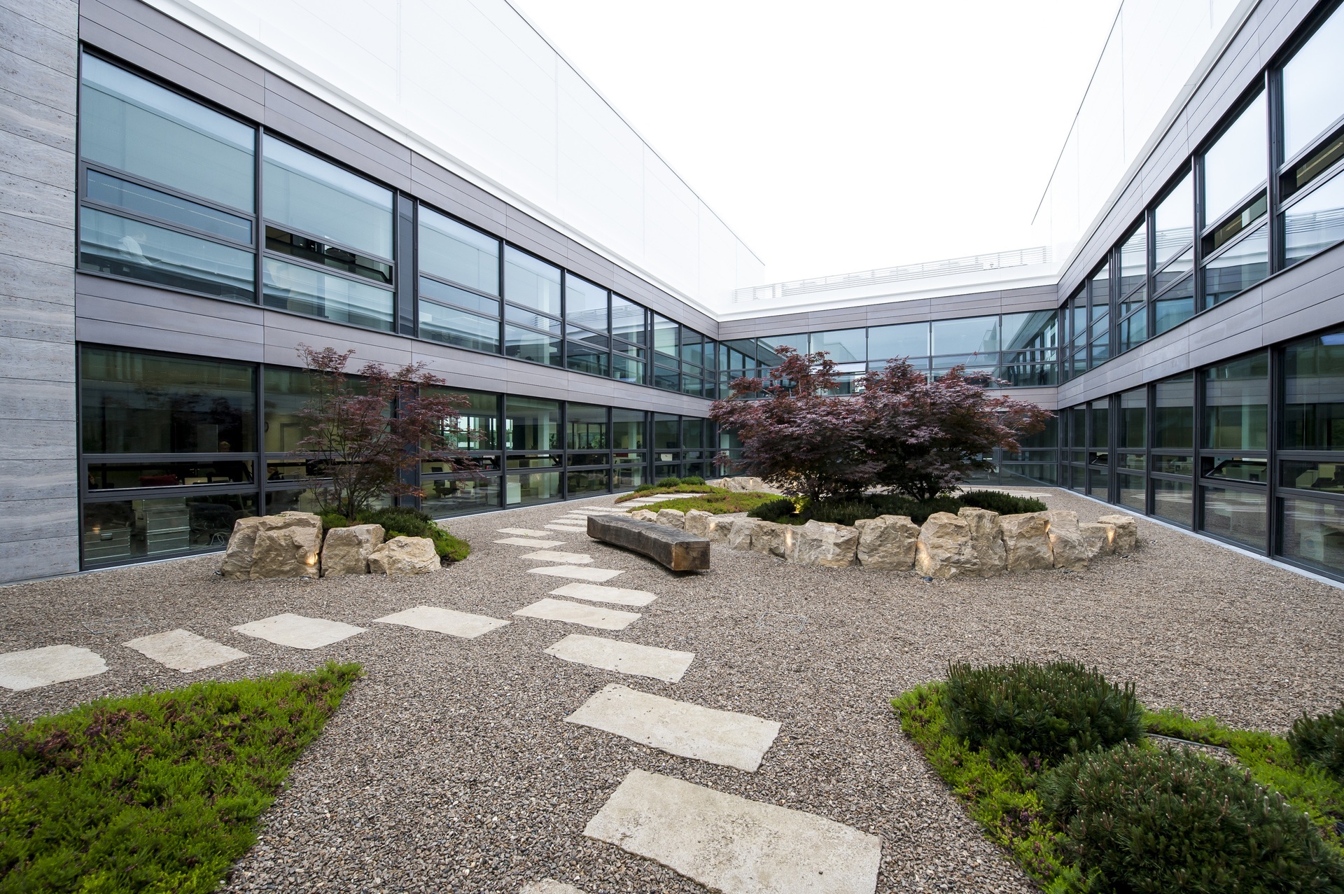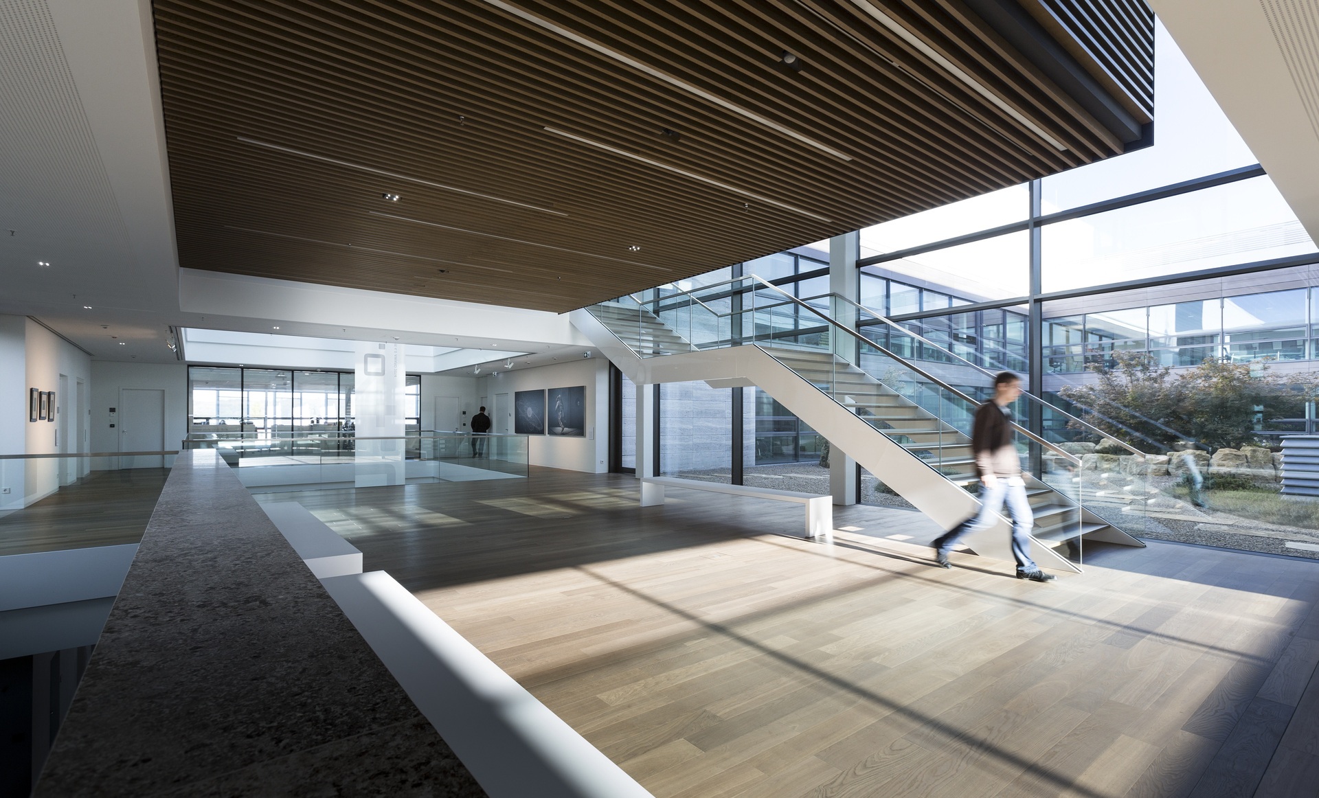 Situated on a slope, the Innovation Factory features a west-facing entrance area that runs past two parallel development and testing areas to access the core of the building. This is where the lobby interlinks all three floors and functions as the building’s vibrant centerpiece. Serving as a marketplace, it fosters interaction between people from management, administration, production, research, and customers closely involved in the development process. Works of art on the walls reinforce the gallery-like atmosphere and the cultural aspect of the marketplace. Located on the building’s central axis, the lobby connects the various work areas and provides a view of the inner courtyards, which are designed as Japanese gardens with boulders from the excavation to invite employees and visitors to unwind and relax. A distinctive feature of the new building is its transparent design, which enables employees and customers to view all production processes through glass walls while ensuring abundant daylighting of all workplaces.