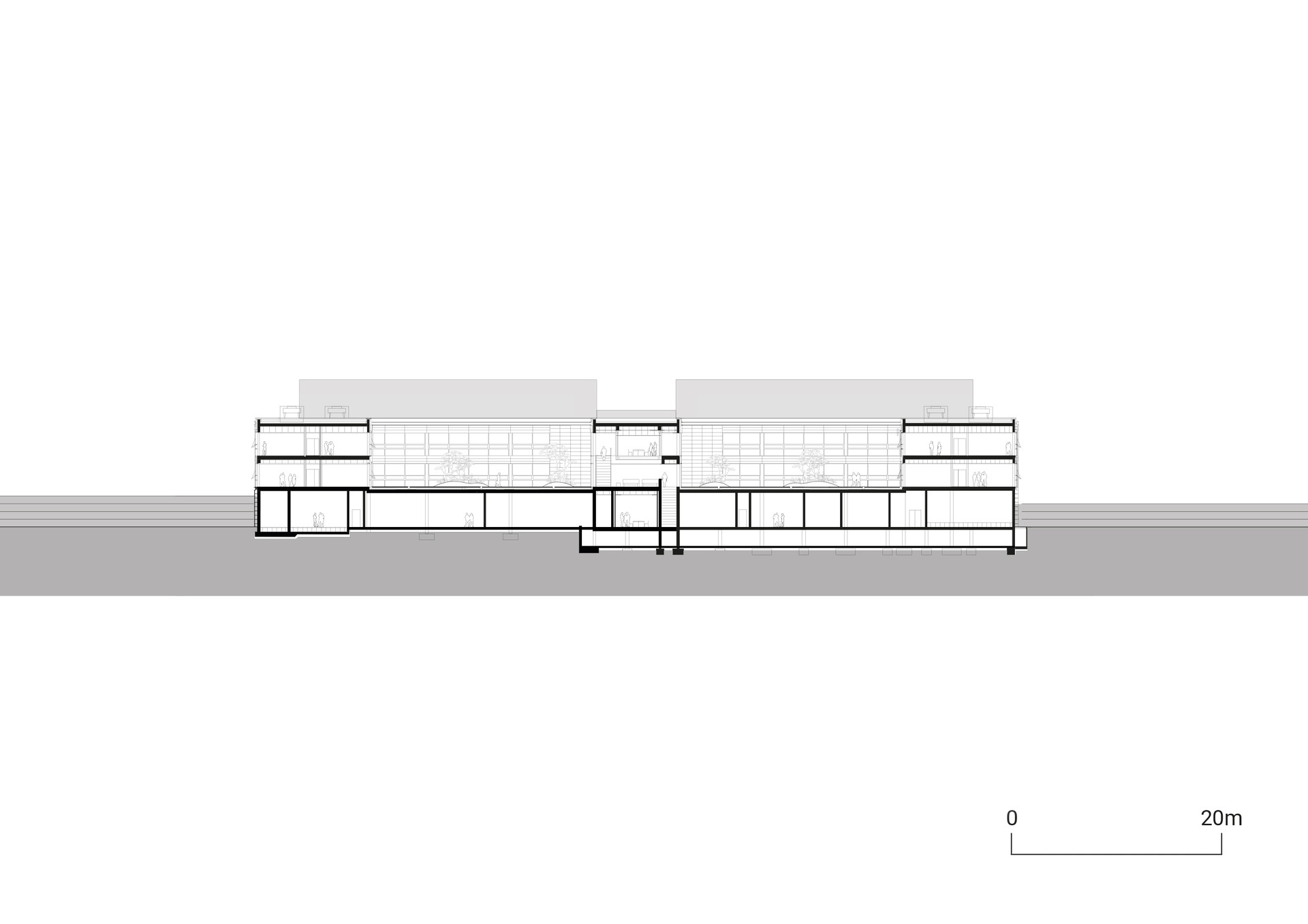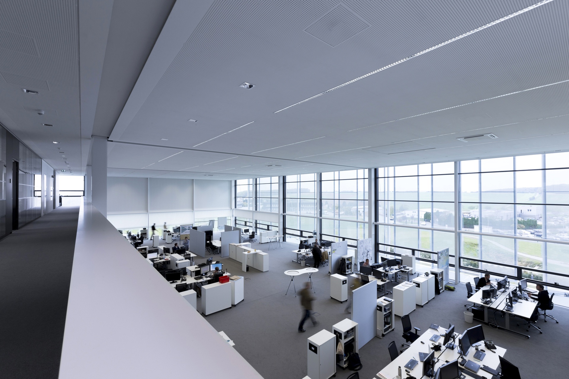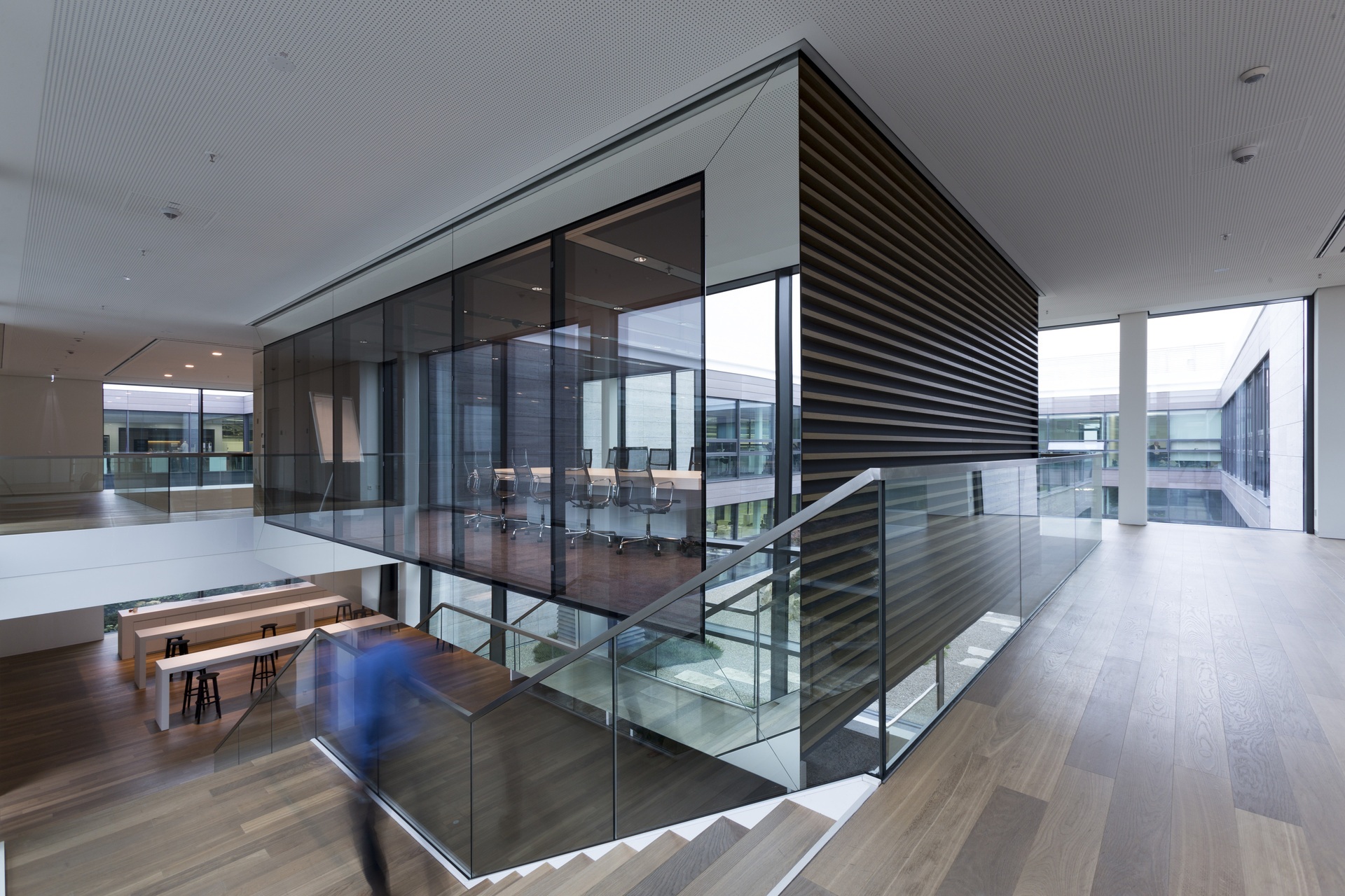 Situated on a slope, the Innovation Factory features a west-facing entrance area that runs past two parallel development and testing areas to access the core of the building. This is where the lobby interlinks all three floors and functions as the building’s vibrant centerpiece. Serving as a marketplace, it fosters interaction between people from management, administration, production, research, and customers closely involved in the development process. Works of art on the walls reinforce the gallery-like atmosphere and the cultural aspect of the marketplace. Located on the building’s central axis, the lobby connects the various work areas and provides a view of the inner courtyards, which are designed as Japanese gardens with boulders from the excavation to invite employees and visitors to unwind and relax. A distinctive feature of the new building is its transparent design, which enables employees and customers to view all production processes through glass walls while ensuring abundant daylighting of all workplaces.