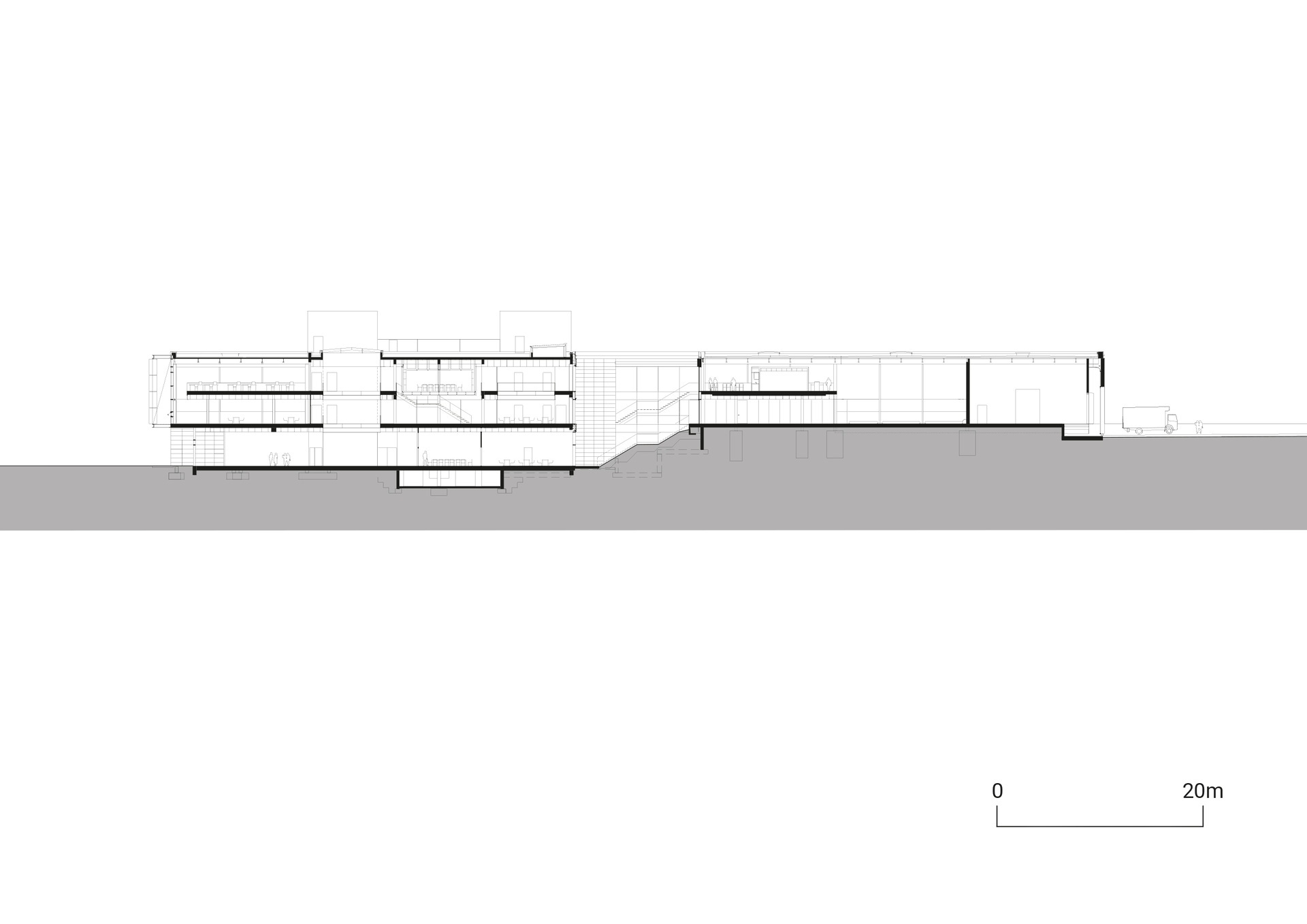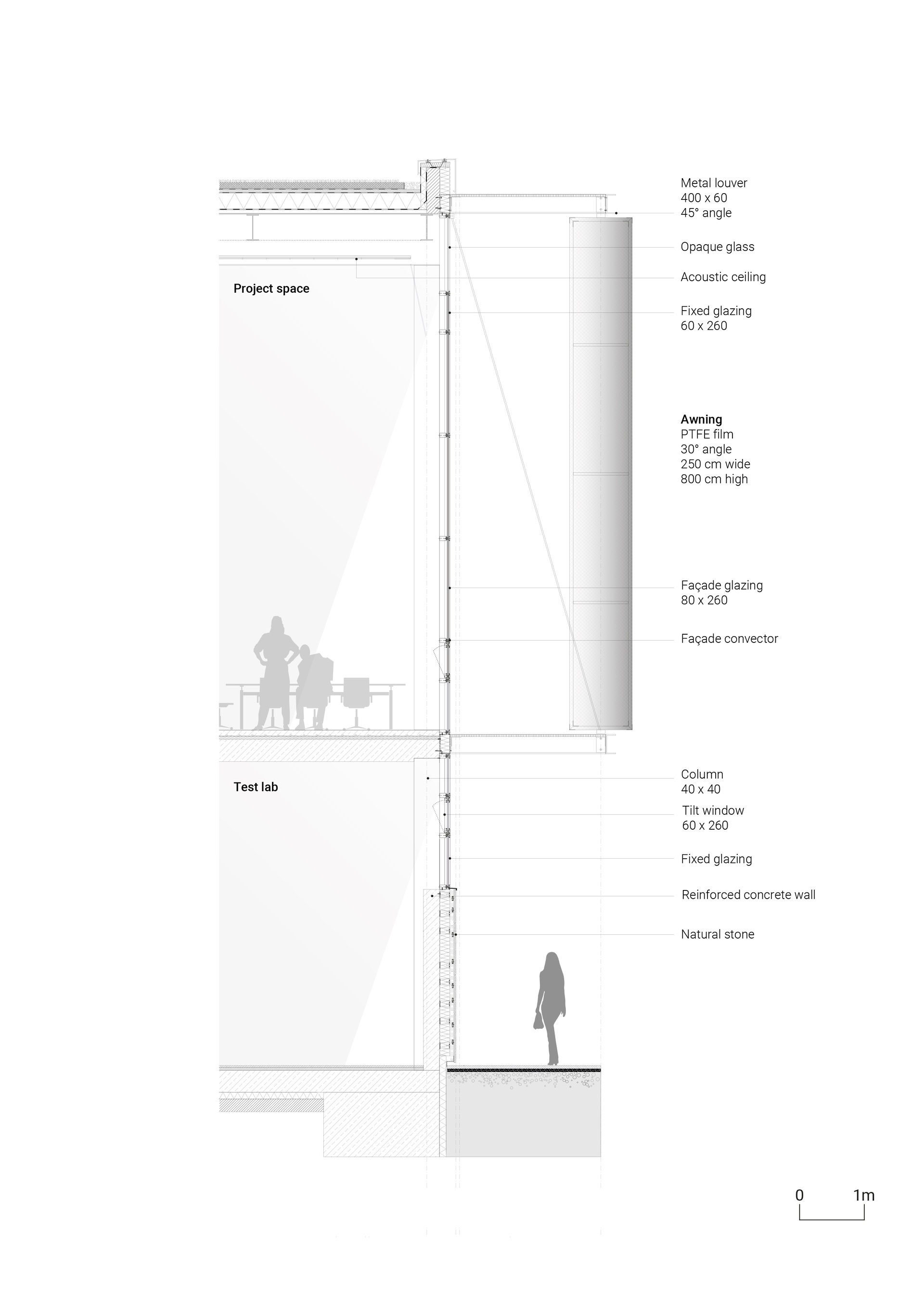 The façade references local architectural tradition: The lower part of the building is made of regional natural stone, while the upper façade elements consist of a weather-resistant, natural, rice-based material instead of conventional wood. The northwest façade is fully glazed on the first and second floors. Translucent, slanted awnings partially block direct sunlight, which reduces the amount of energy required for cooling while fully retaining the view to the outside.